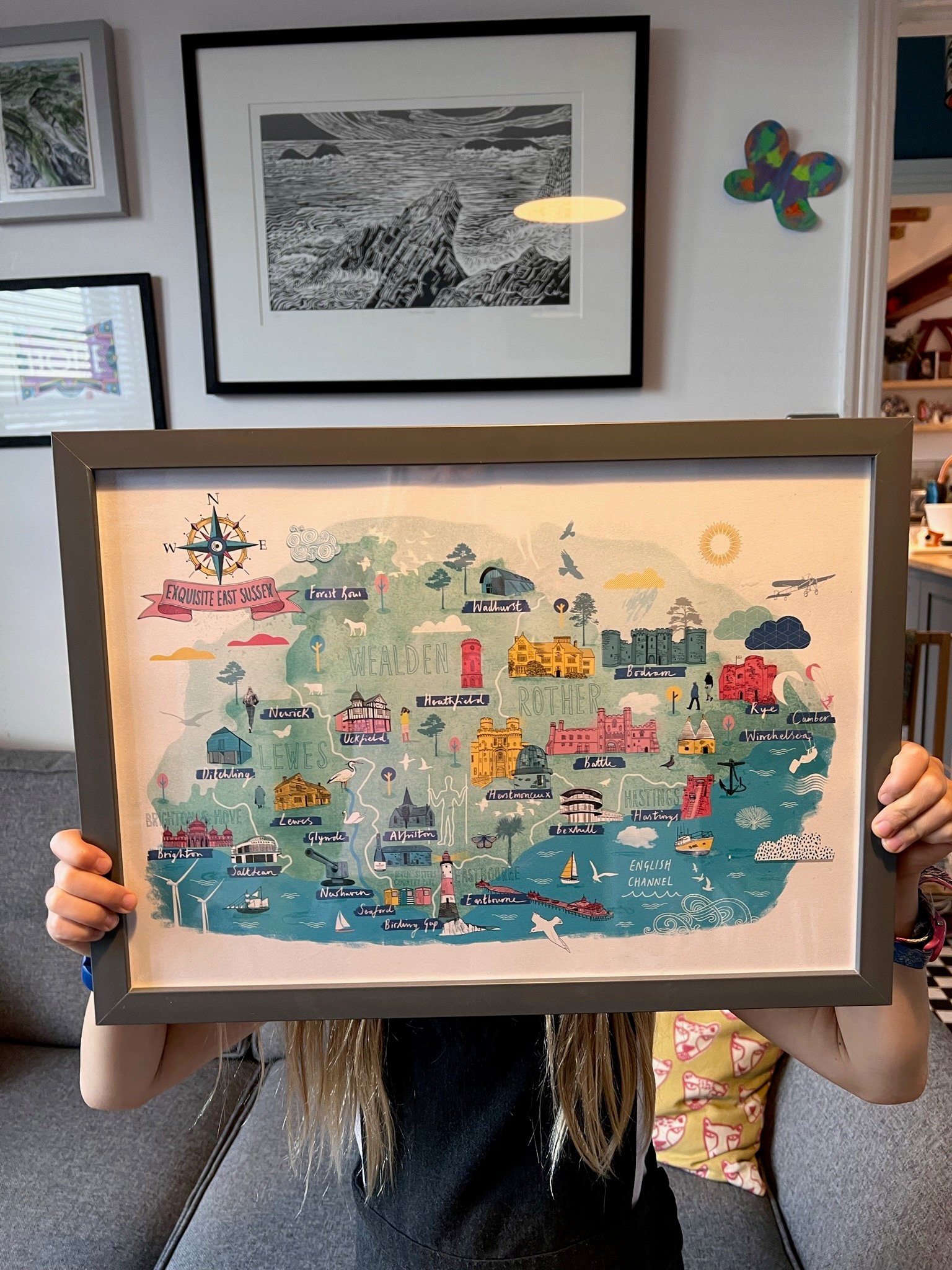 High quality print of an illustrated hand drawn map of the county of Exquisite East Sussex. Printed on good quality recycled paper made from paper cups and using vegetable oil inks.