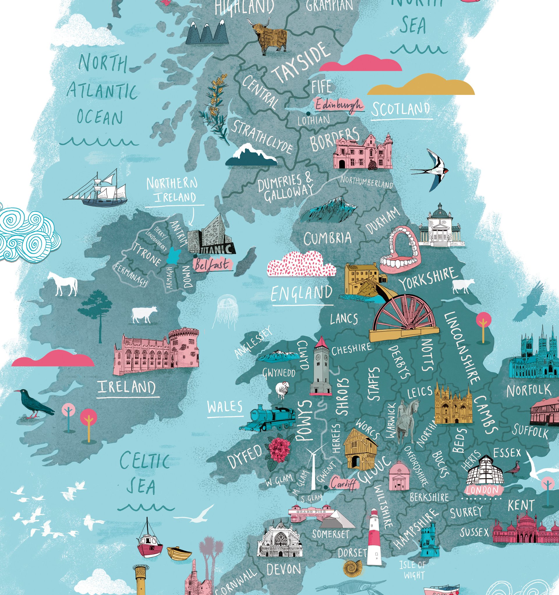 High quality print of an illustrated hand drawn map of the British Isles. Printed on good quality recycled paper made from paper cups and using vegetable oil inks.