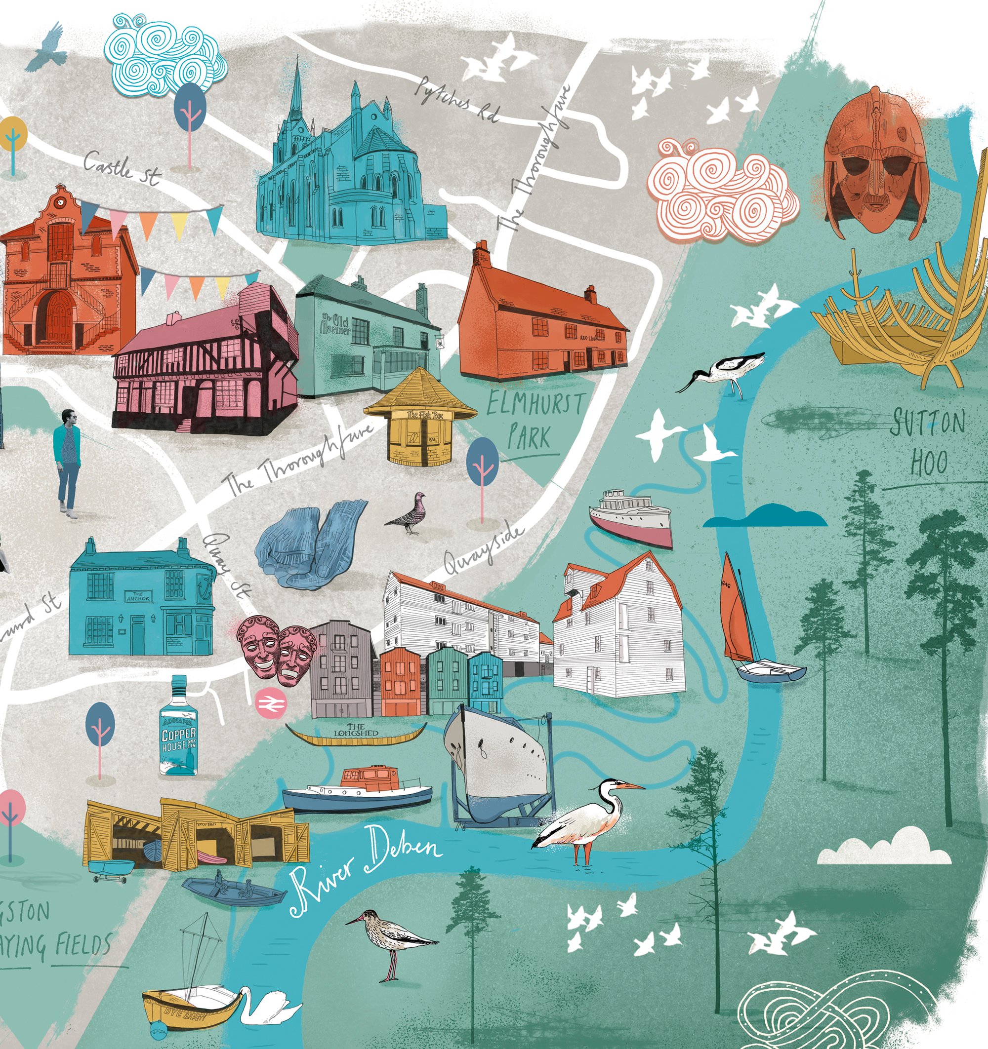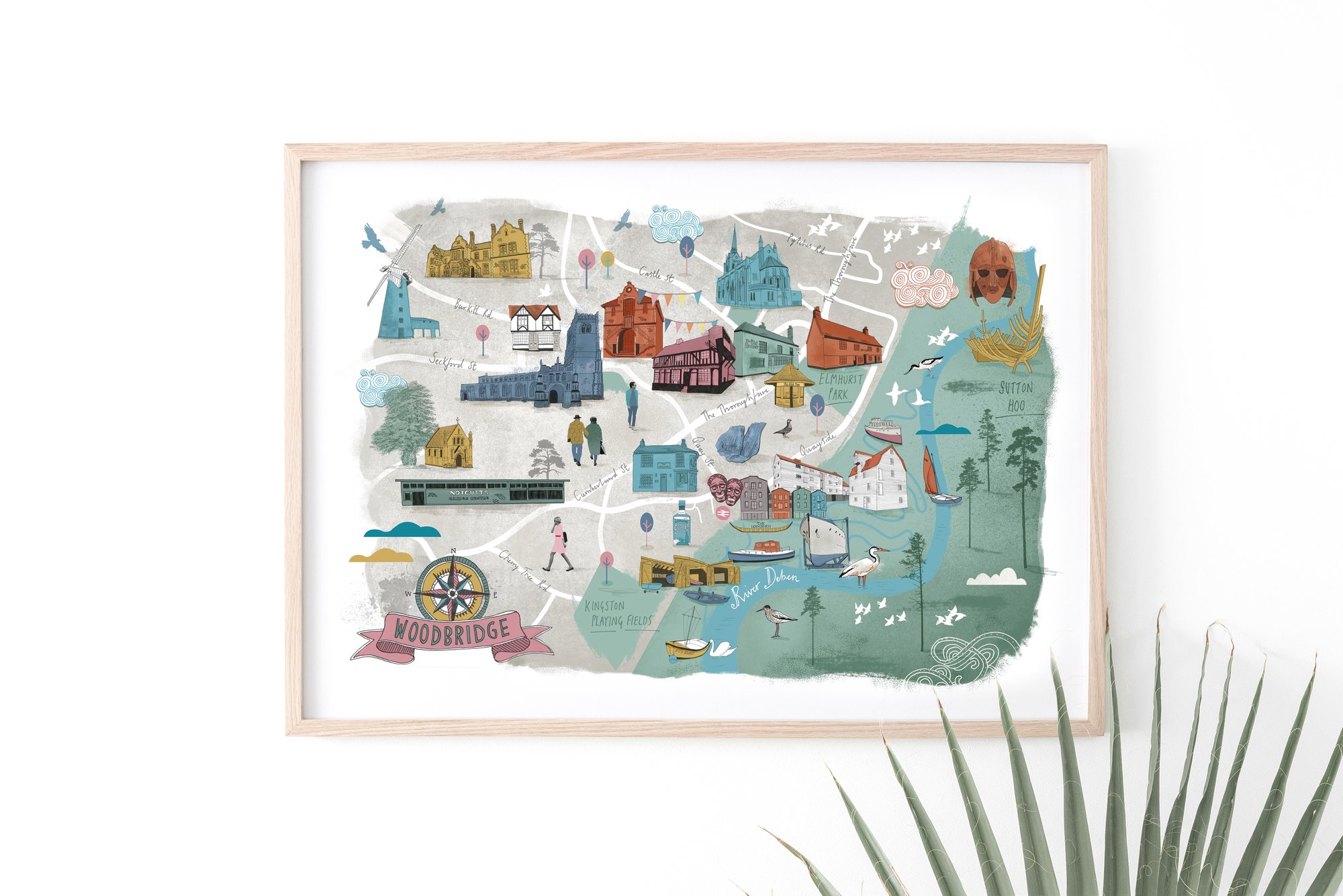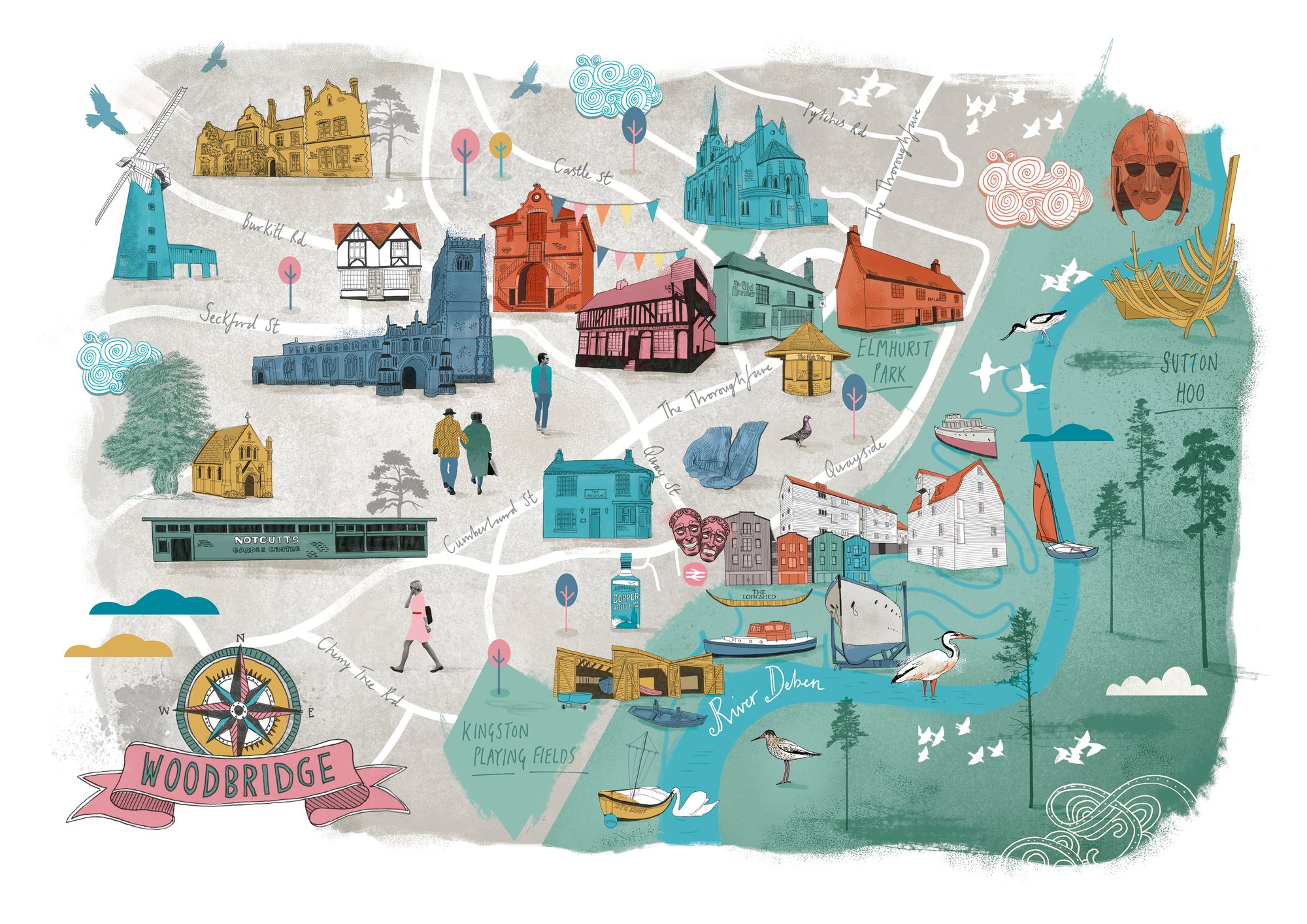High quality print of an illustrated hand drawn map of Woodbridge, Suffolk.